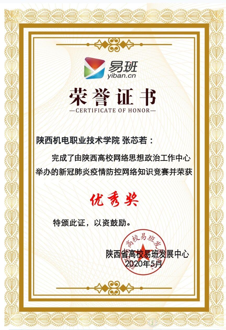 陕西高校网络思想政治工作中心、陕西省高校易班发展中心发布《陕西高校大学生新型冠状病毒肺炎疫情防控网络知识竞赛获奖名单的公告》,公布本次知识竞赛优秀组织奖名单和个人获奖名单,其中全省高校优秀组织奖15个(其中高职类院校5个),高校个人奖227个(其中高职类院校56个)。我校师生在本次知识竞赛中表现出色,喜获“优秀组织奖”,我院16动漫五年班张芯若同学获得“优秀奖”。
