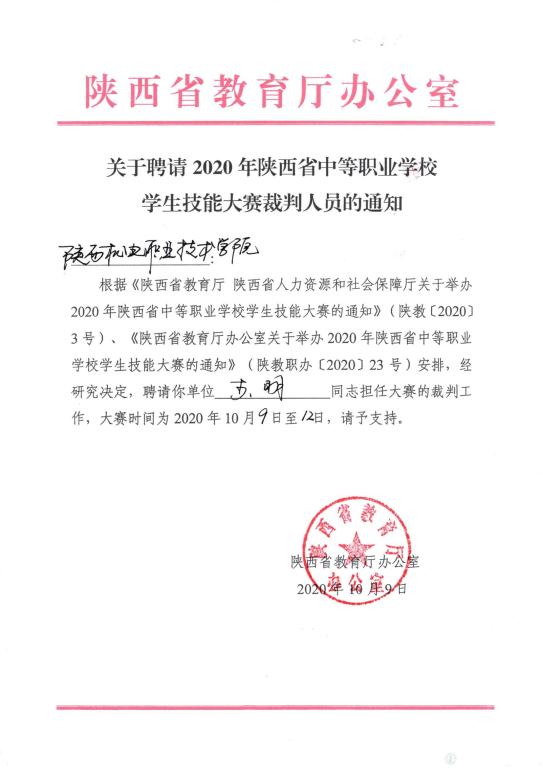 学院名师工作室主持人、基础部李明副教授荣聘2020年陕西省中等职业学校技能大赛裁判长