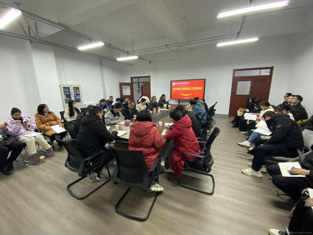 我校12月学生工作会于2023年12月13日上午在蟠龙校区强技楼会议室召开,党委副书记张琴,各二级学院党支部书记、学工办主任、学生处、校团委科级以上干部、专职辅导员、新疆派驻教师参加,会议由党委学工部部长、学生处处长、人武部部长王建斌主持。