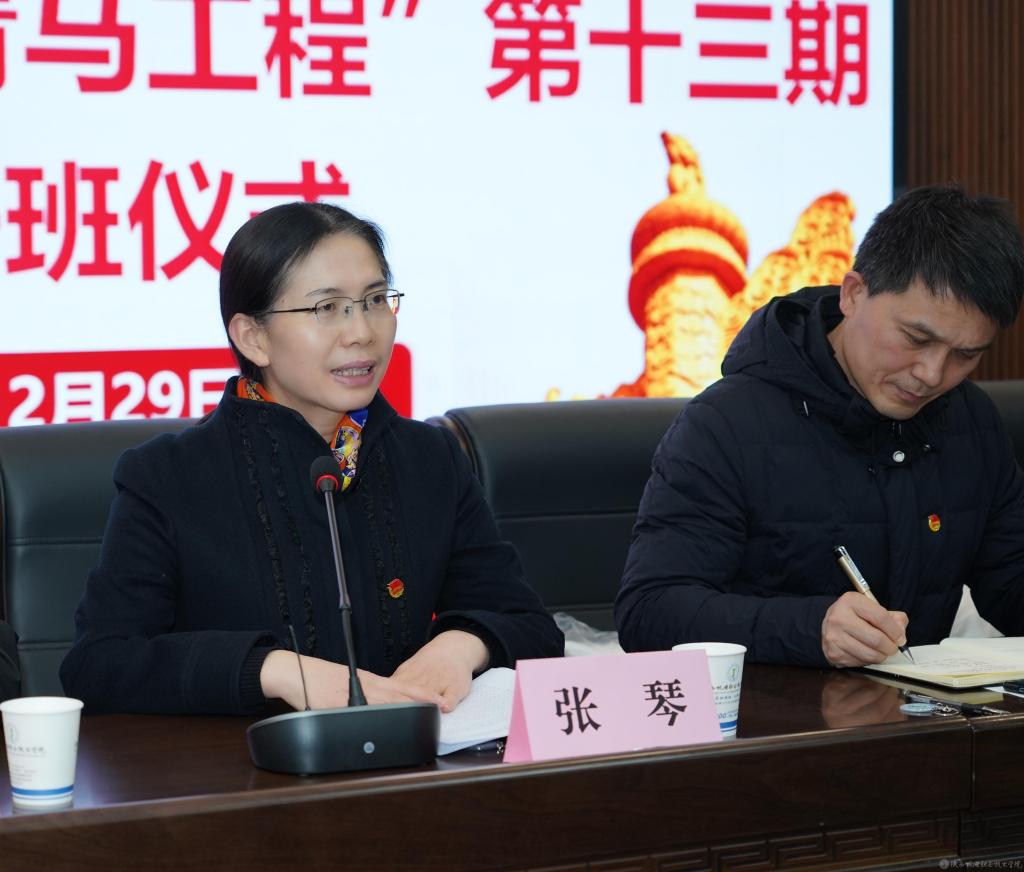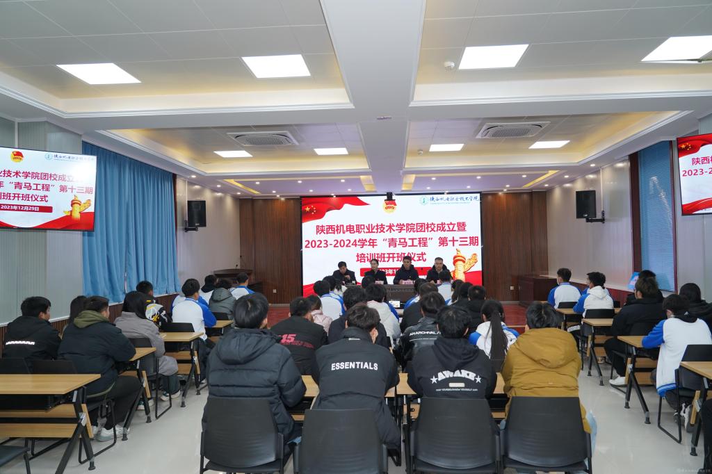 2023年12月29日下午,我校在蟠龙校区博学楼111会议室召开陕西机电职业技术学院团校成立暨2023-2024学年“青马工程”第十三期培训班开班仪式,宝福路校区在汽车机电大楼4楼视频会议室同步进行。党委副书记张琴,党委委员、院长助理赵争东,马克思主义学院负责人王康,各二级学院团总支书记、副书记,第十三期青马班全体成员、学生干部参加开班仪式。仪式由团委书记王枢主持。