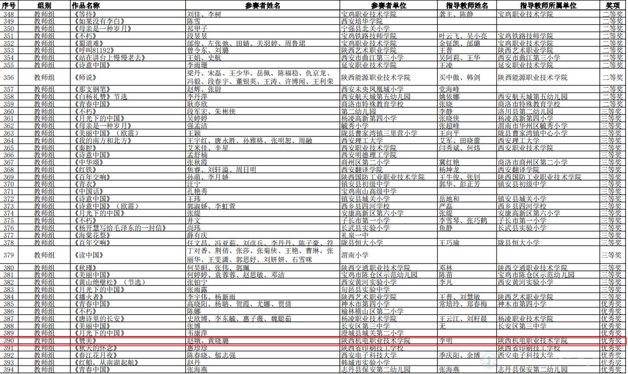 日前,由陕西机电职业技术学院基础部组织选送的学生作品《叩问青铜》(陈世豪、沈佳楠、李雨笑、刘子月)和教师《赞美》(赵娥、黄晓璐),在陕西省教育厅主办的第六届中华经典诵写讲大赛(陕西赛区)中荣获职业院校学生组一等奖和教师组优秀奖。