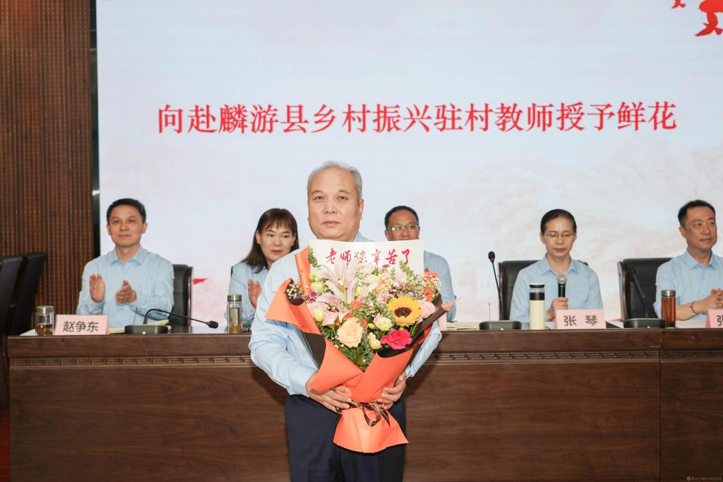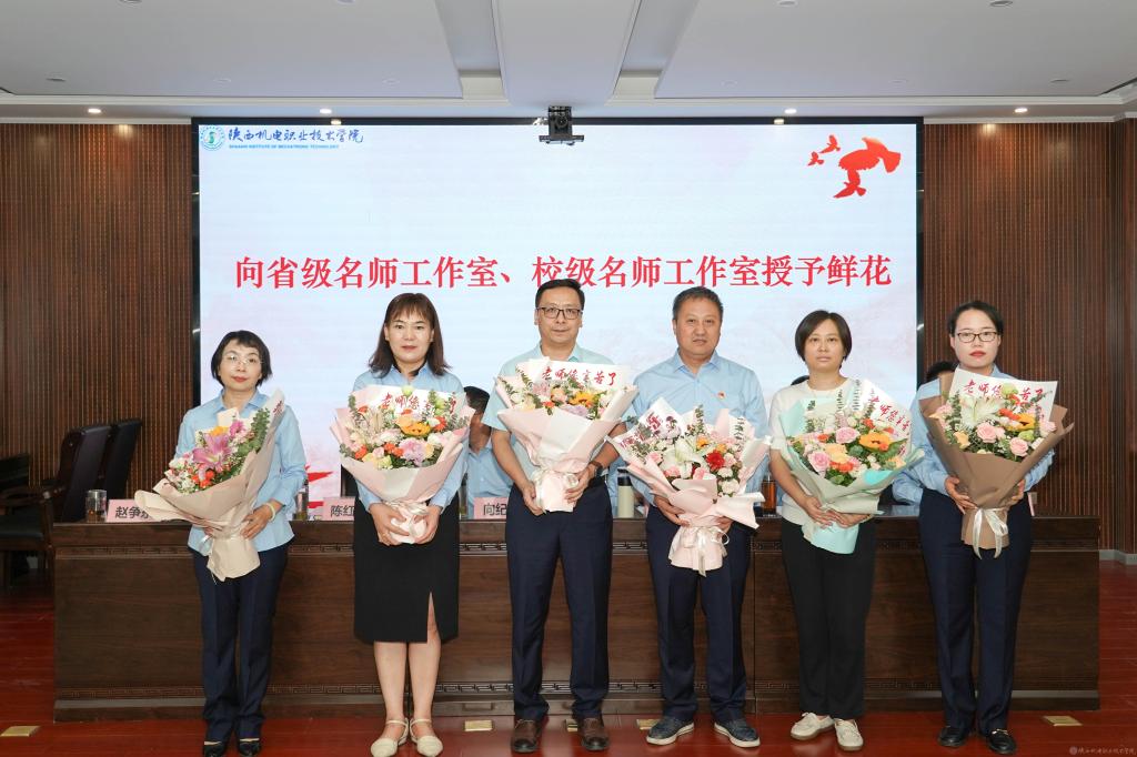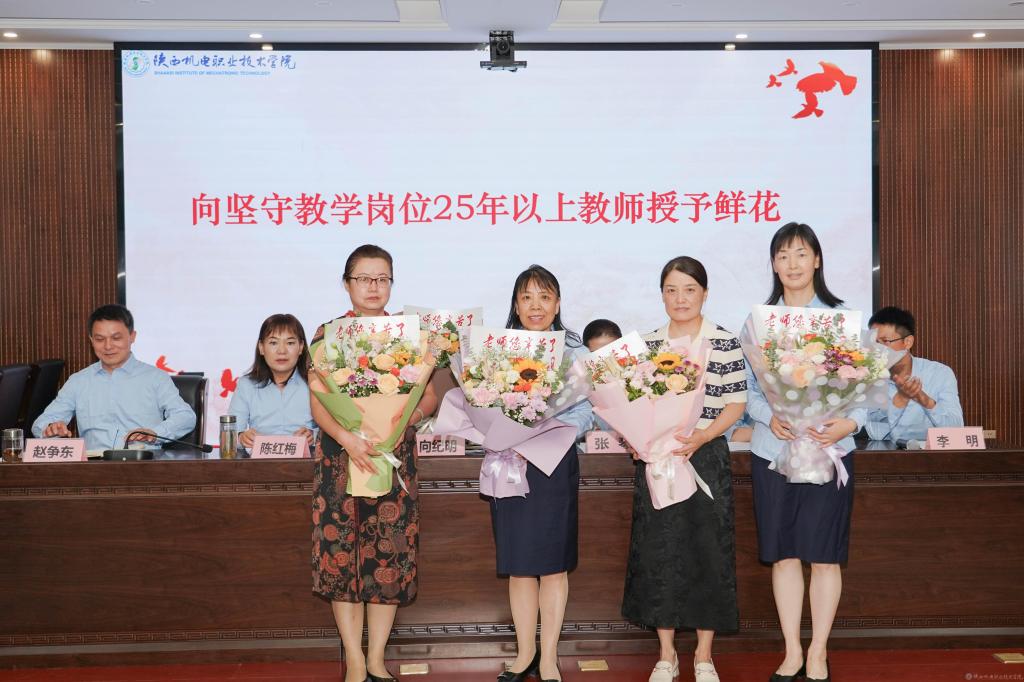 校领导为省级、校级名师工作室、赴麟游县乡村振兴驻村教师、坚守教学岗位25年以上教师授予鲜花。