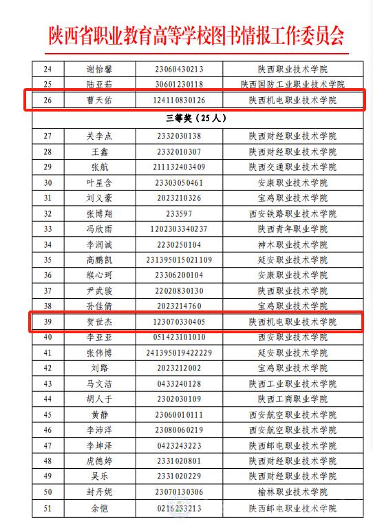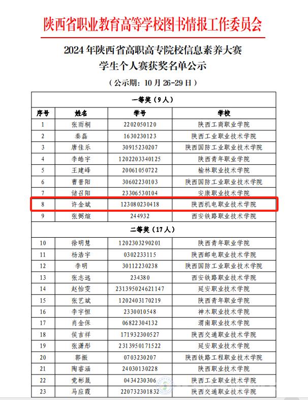 10月26日,由陕西省职业教育高等学校图书情报工作委员会主办的2024年陕西省高职高专院校信息素养大赛暨“中文在线杯”第六届全国大赛选拔赛圆满落幕。此次大赛吸引了全省21所高职院校的84名选手参与。经过激烈角逐,我校智能制造学院学生许金斌脱颖而出,荣获一等奖,铁道工程学院学生曹天佑荣获二等奖,电子信息学院学生贺世杰荣获三等奖。其中,许金斌和曹天佑两位同学入围国赛资格名单。