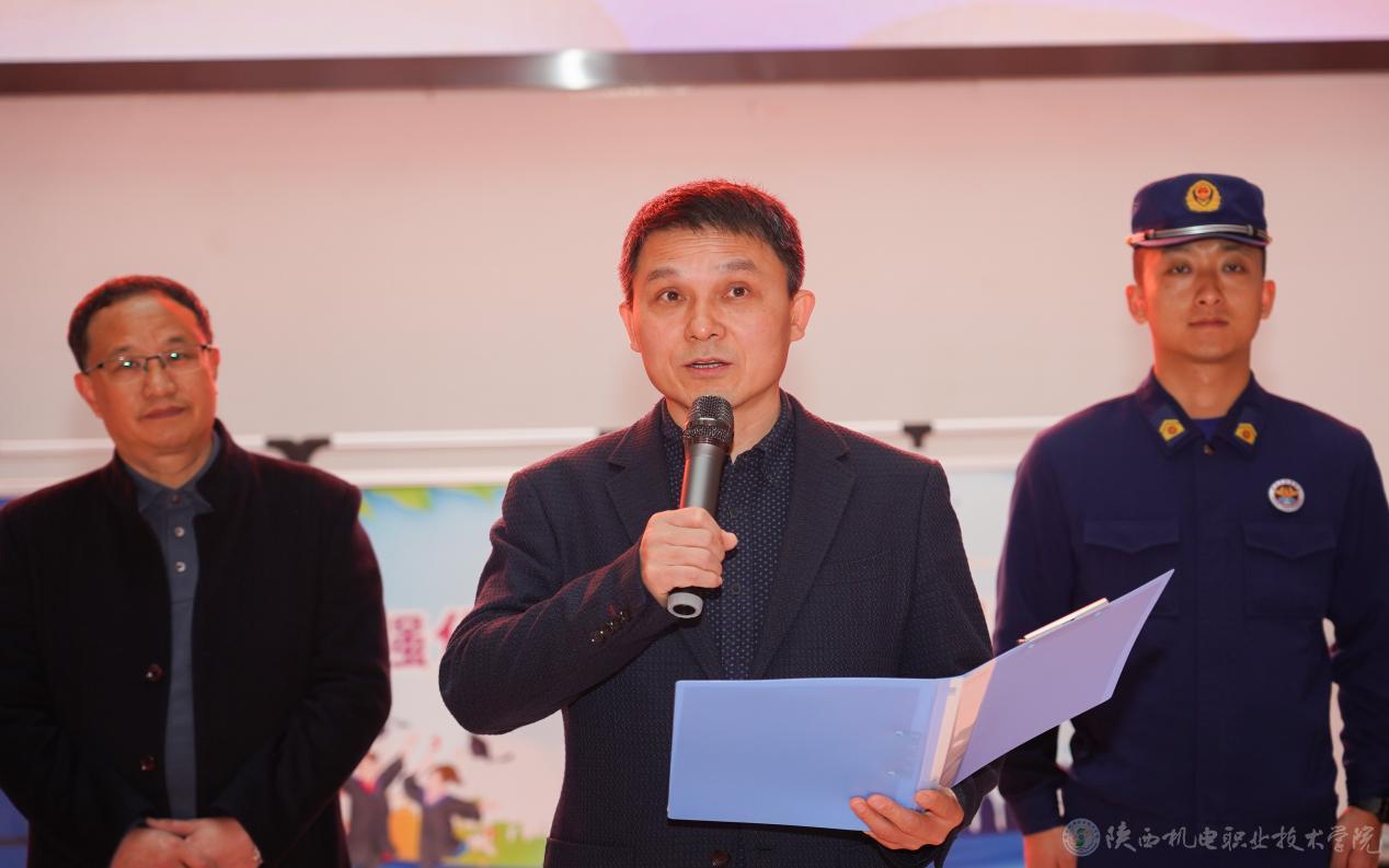 庞建军宣布陕西机电职业技术学院2024年“119”消防宣传月暨消防安全课进校园活动启动。