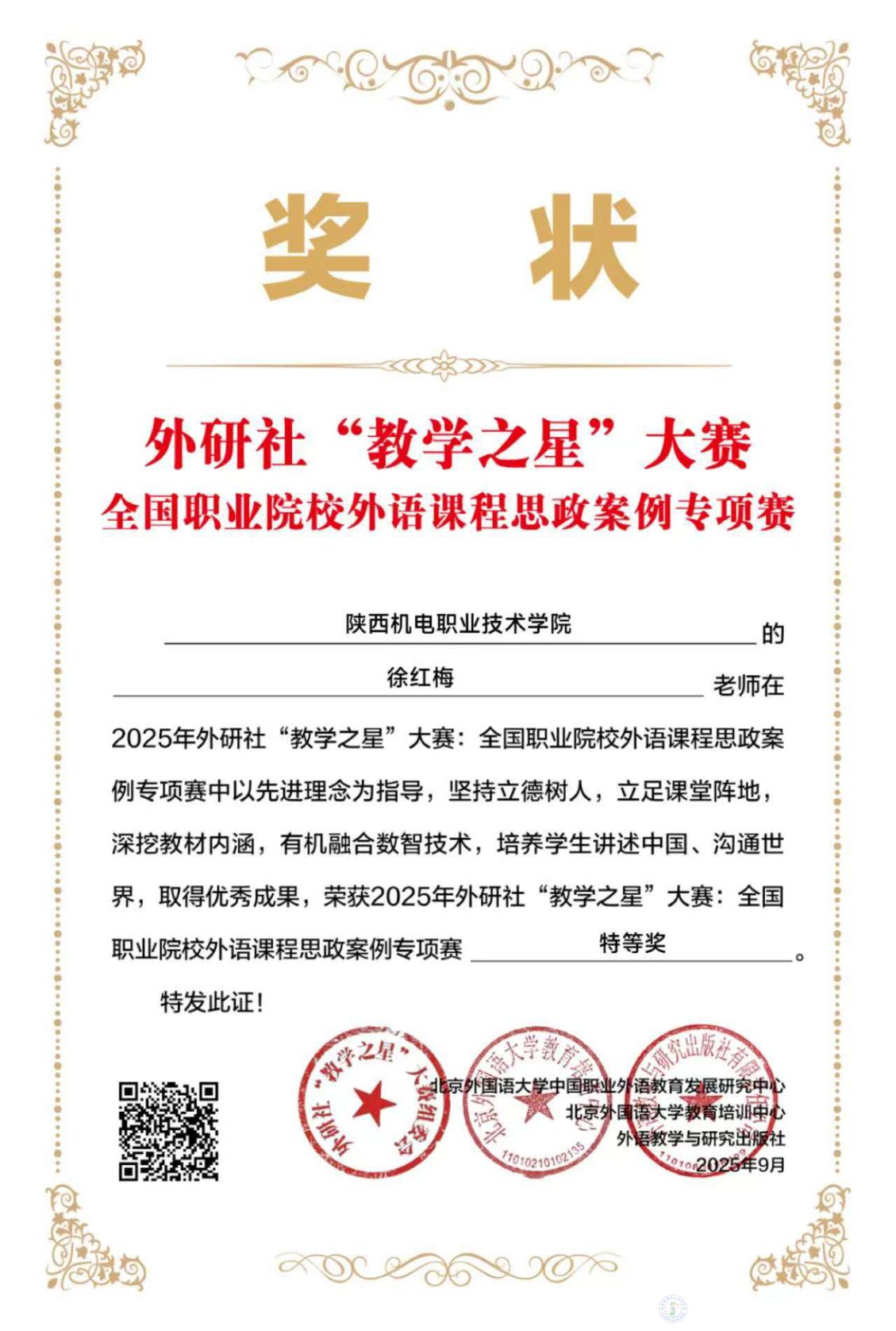近日,2025年外研社“教学之星”大赛全国职业院校外语课程思政案例专项赛圆满落幕。陕西机电职业技术学院基础部英语教研室徐红梅老师凭借扎实的教学功底和独具创新的思政案例设计,在高职英语组赛道脱颖而出,荣获全国特等奖,为学校赢得殊荣。